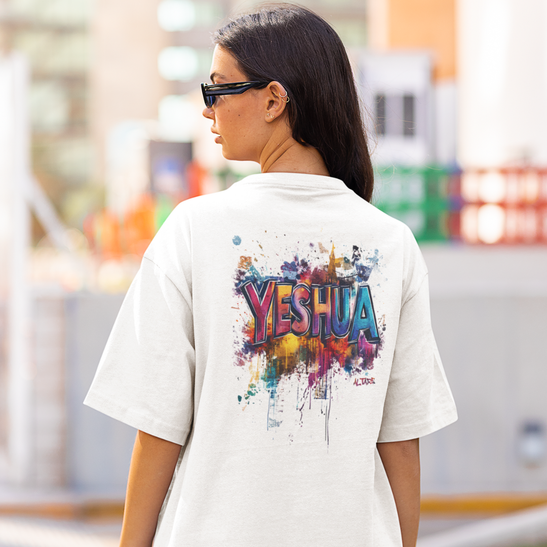 A estampa “YESHUA” traz o nome de Jesus em hebraico com um design vibrante, moderno e cheio de personalidade. Cores vivas e respingos artísticos simbolizam o impacto transformador de Cristo em nossas vidas.