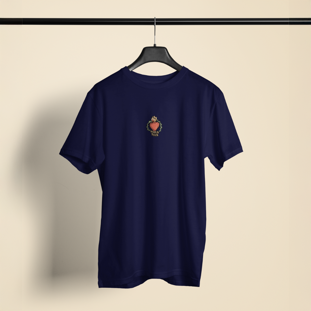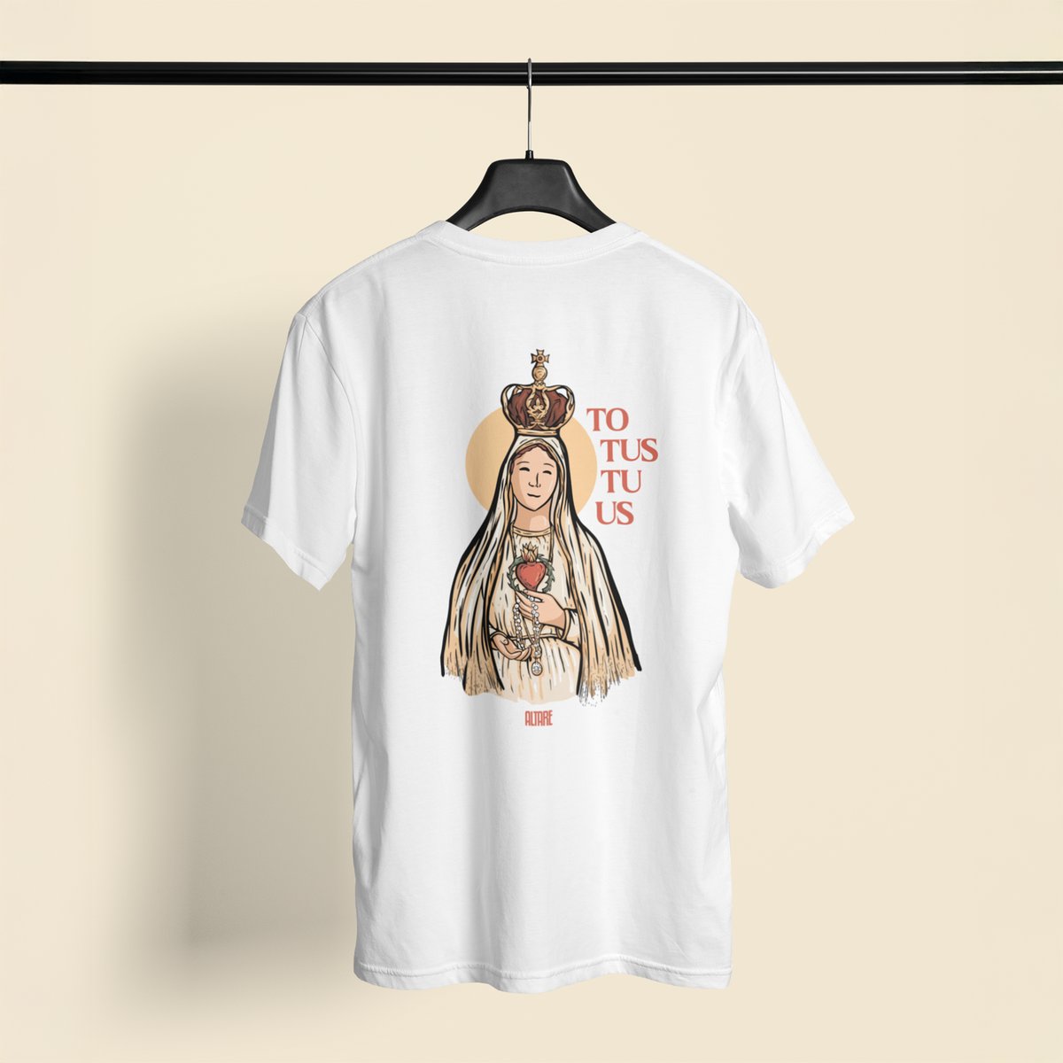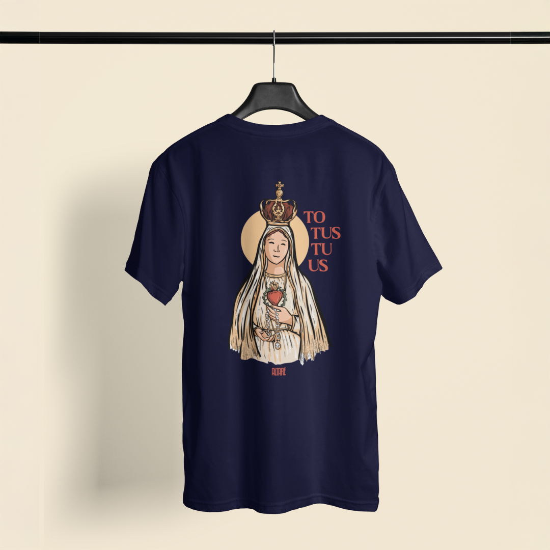 O design minimalista na parte frontal traz um detalhe do Sagrado Coração, enquanto a estampa das costas apresenta uma ilustração exclusiva de Nossa Senhora de Fátima com a inscrição "Totus Tuus", expressão que simboliza a entrega total a Maria.